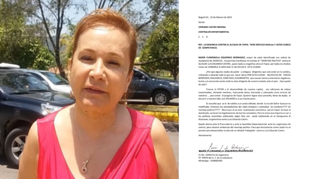 La curtida política boyacense, quien hace 30 años reinaba en Casanare, terció a favor del alcalde yopaleño, oriundo de Labranzagrande. En la carta al jefe del ente de control fiscal departamental -quien presentó la denuncia antes los organismos de control-, María Izquierdo señala que “no es de su competencia investigar sobre supuestos videos que no tienen la calidad de sonido ni de imagen -confiables- y en donde su contenido tampoco da claridad”. Considera que esta acción en contra del alcalde de Yopal es producto de acciones de politiqueros a los que ella califica como “viudos del poder”.