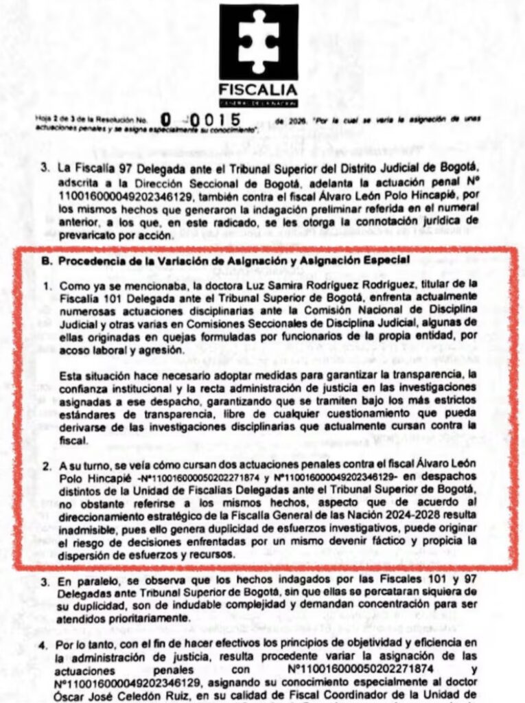 Según el documento enviado por la fiscal Rodríguez, la resolución que la retiró del caso se sustentó en argumentos que calificó como erróneos y basados en “falsas motivaciones”. Entre las razones expuestas en la decisión firmada por Camargo se indicó que la fiscal tenía “numerosas” investigaciones disciplinarias y que existía una duplicidad de procesos, al haber dos radicados y fiscales distintos en el mismo caso.