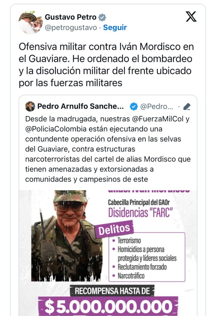 “Ofensiva militar contra Iván Mordisco en el Guaviare. He ordenado el bombardeo y la disolución militar del frente ubicado por las Fuerzas Militares”, indicó el jefe de Estado en la noche de este lunes.