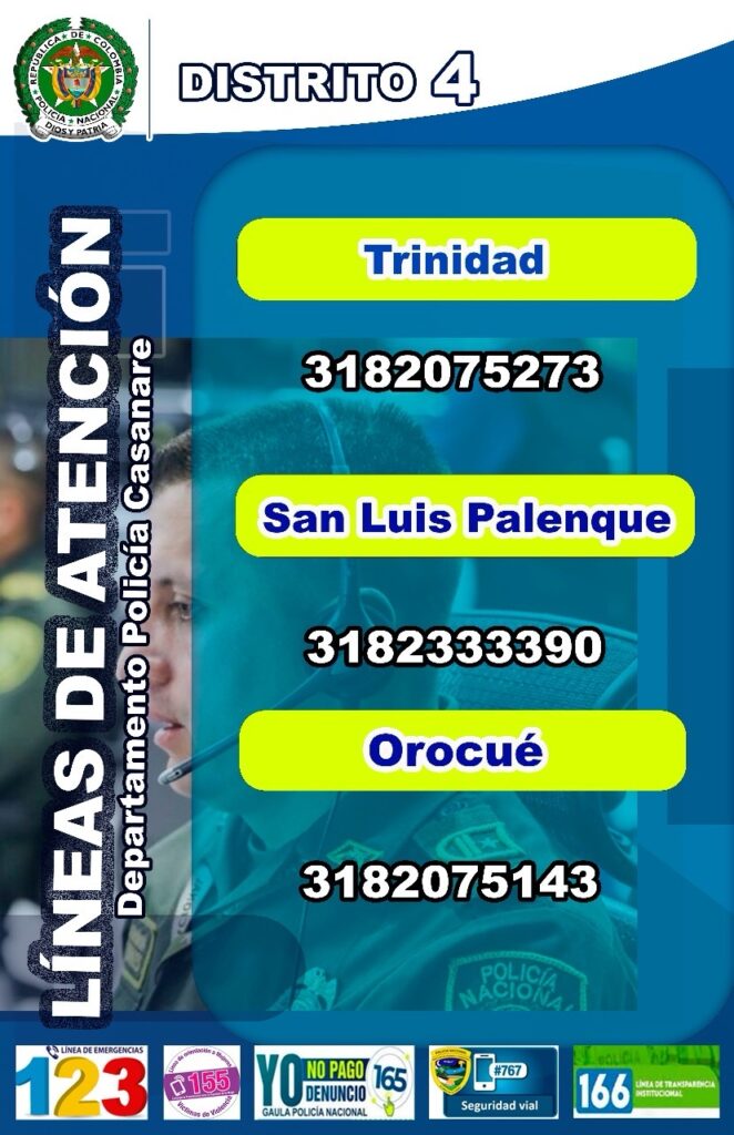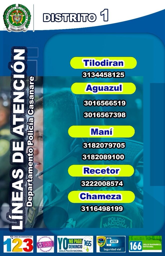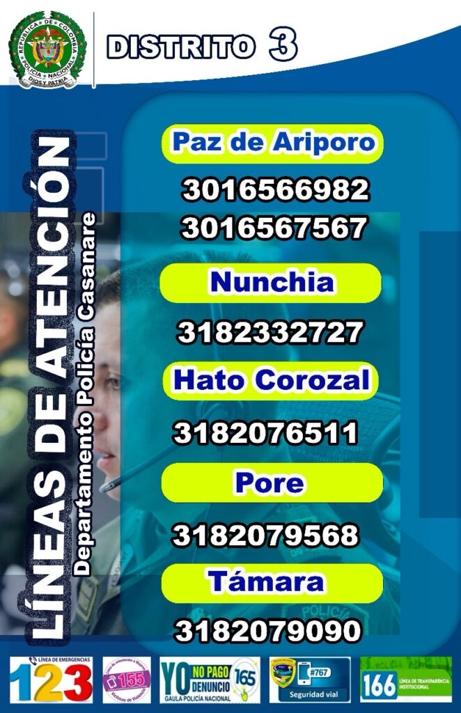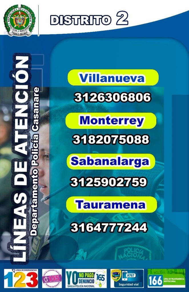 La Policía Nacional en el departamento de Casanare dio a conocer los números telefónicos de contacto de sus diferentes unidades, con el objetivo de garantizar una atención rápida y oportuna ante cualquier situación que afecte la seguridad o la convivencia ciudadana.