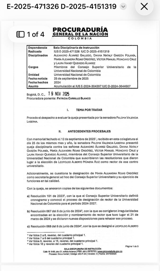 La Procuraduría General de la Nación abrió una investigación disciplinaria contra la exministra de Educación del gobierno Petro, Aurora Vergara, y contra varios integrantes del Consejo Superior Universitario de la Universidad Nacional, por las graves irregularidades en el proceso de elección de rector en 2024.