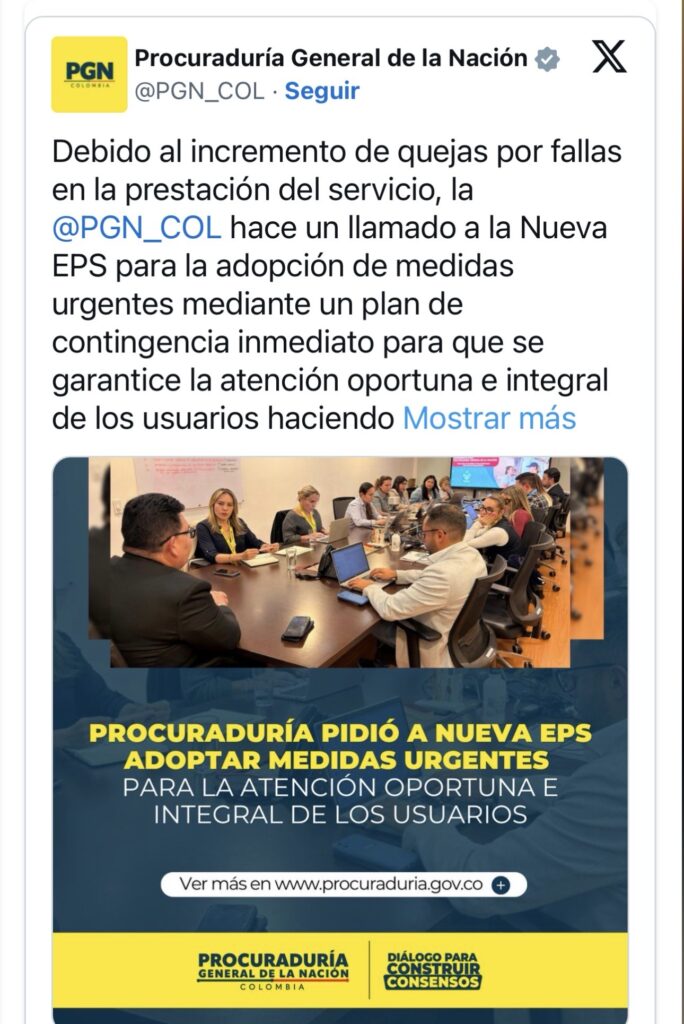 La Procuraduría General de la Nación solicitó este viernes, 9 de enero, a la Nueva EPS la adopción inmediata de un plan de contingencia y de acciones de choque para enfrentar las fallas en la prestación del servicio, especialmente en lo relacionado con la disponibilidad y entrega de medicamentos.