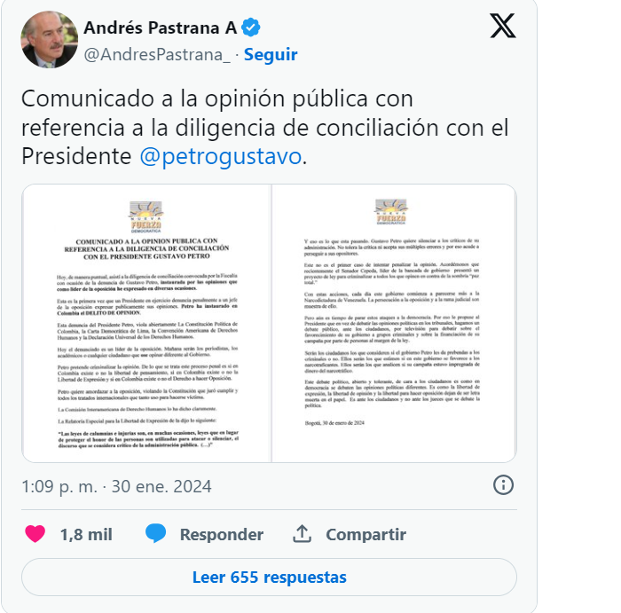 Igualmente, aprovechó la oportunidad para alertar sobre la gravedad de la denuncia que presentó Petro en su contra por los delitos de injuria y calumnia, asegurando que, con esto, el jefe de Estado quiere acallar a la oposición y las críticas.
