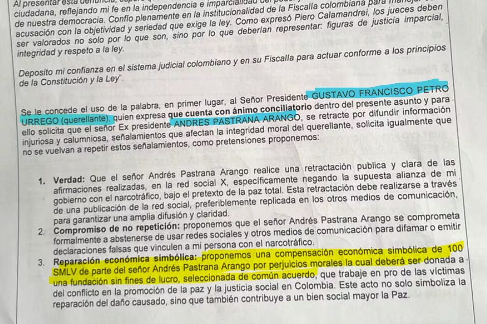 En la petición, se resalta que “este acto no solo simboliza la reparación del daño causado, sino que también contribuye a un bien social mayor: la paz”. En otro aparte, se advierte que el expresidente Pastrana debe publicar en su cuenta de X –antes Twitter– una retractación pública de las afirmaciones que hizo en noviembre pasado.