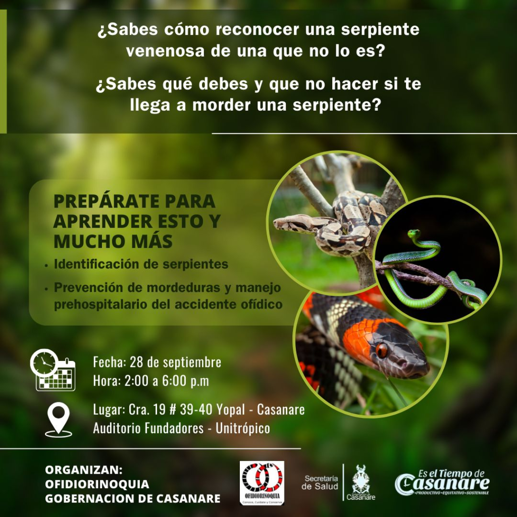 Con el fin de aprender sobre la identificación de las serpientes 🐍, la prevención y cuidados pre hospitalarios en caso de accidente ofídico, la Secretaría de Salud de Casanare adelantará hoy jueves 28 de septiembre, la capacitación de ¿Cómo reconocer una serpiente venenosa de una que no lo es? 🤔¿Sabes qué debes y qué no hacer si te llega a morder una serpiente?