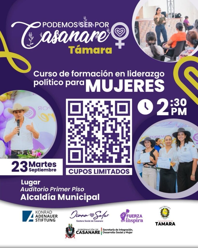 El próximo martes 23 de septiembre a las 2:30 p. m., el auditorio del primer piso de la Alcaldía de Tamara abrirá sus puertas para recibir a mujeres líderes, gestoras y ciudadanas comprometidas con el cambio. Se trata del curso de formación en liderazgo político “Podemos Ser por Casanare”, una iniciativa que busca fortalecer las capacidades de participación, representación y toma de decisiones de las mujeres en el ámbito público.