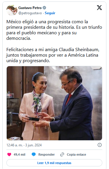 Esta no es la única reacción a la victoria de Sheinbaum. De su misma ala, Gustavo Petro también felicitó a la electa presidenta a través de su cuenta en X, donde escribió: “México eligió a una progresista como la primera presidenta de su historia. Es un triunfo para el pueblo mexicano y para su democracia. Felicitaciones a mi amiga Claudia Sheinbaum, juntos trabajaremos por ver a América Latina unida y progresando”.