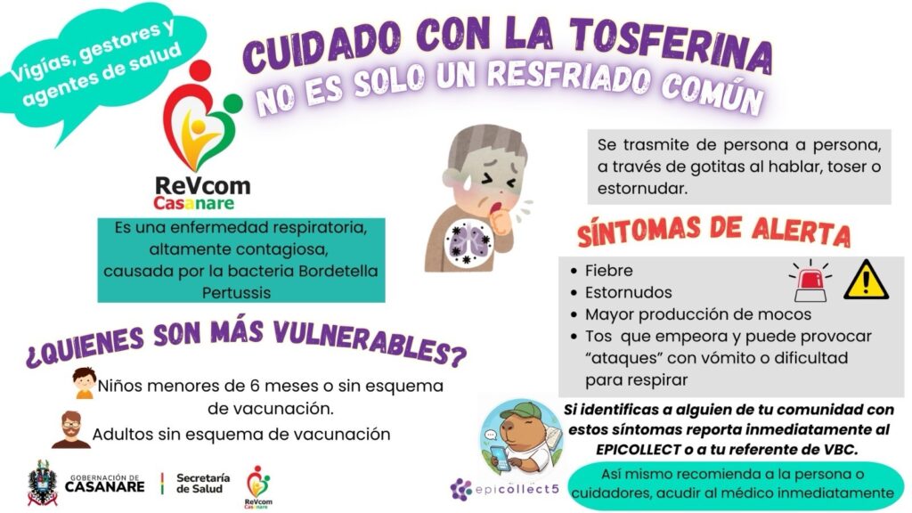 La enfermedad es causada por la bacteria Bordetella Pertussis y se transmite a través de las secreciones que se expulsan al toser o estornudar. Colombia desde el año 2025 se declaró en alerta por esta enfermedad, dada su alta probabilidad de contagio. En el departamento de Casanare con corte a la Semana Epidemiológica 6 del 2026, se han reportado cuatro (4) casos procedentes de los municipios de Yopal y de Paz de Ariporo.