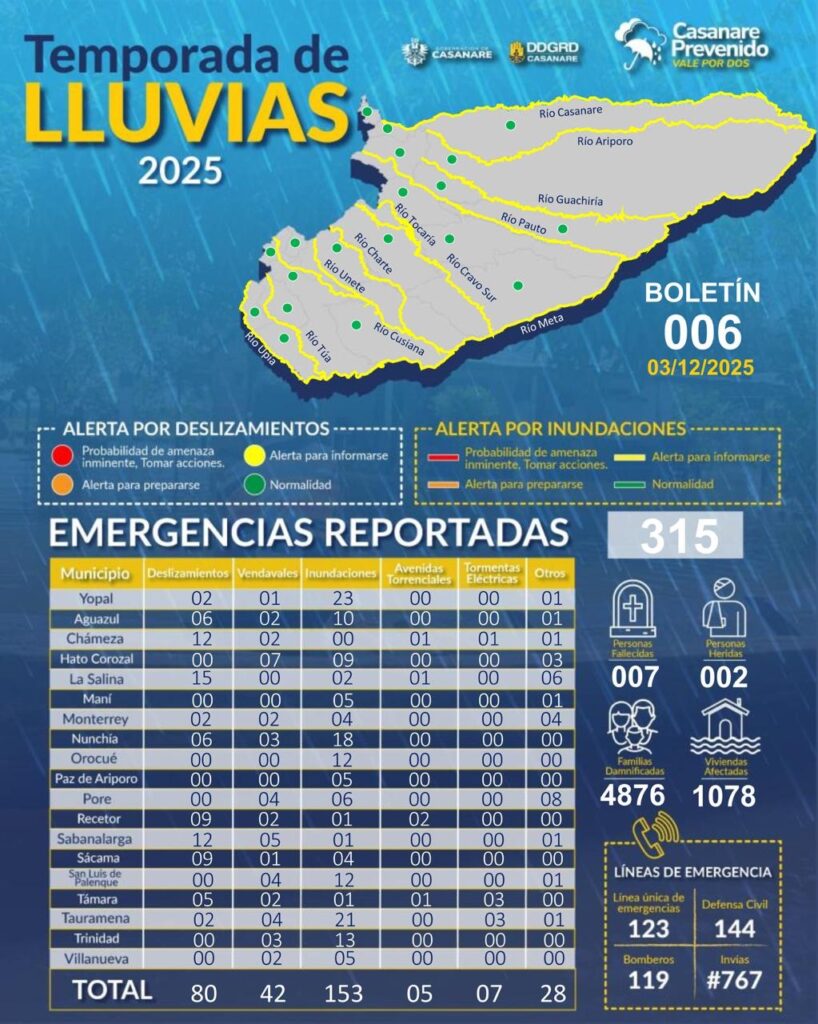 En este sentido, de acuerdo con el registro presentado por Guillermo Velandia, jefe de la Gestión del Riesgo en Casanare, durante el periodo invernal se reportaron 315 eventos naturales, en los que perdieron la vida siete personas y 4.876 hogares damnificados; por deslizamientos, inundaciones, vendavales y tormentas eléctricas. El ingeniero Velandia destacó el trabajo conjunto con organismos de socorro, alcaldías y empresas privadas para atender rescates, remover deslizamientos y apoyar a las familias damnificadas.