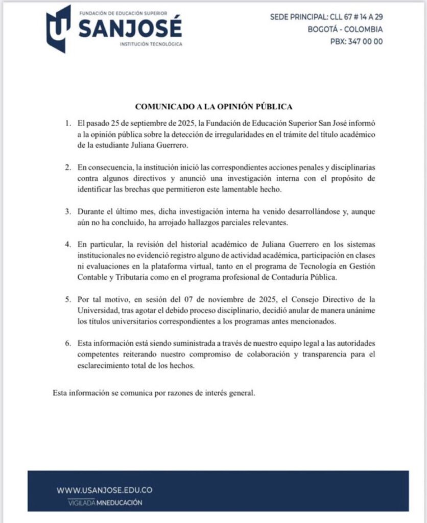 Frente a la decisión de la Fundación San José, el centro de educación superior expresó a través de un comunicado de prensa: “Por tal motivo, en sesión del 7 de noviembre de 2025, el Consejo Directivo de la Universidad, tras agotar el debido proceso disciplinario, decidió anular de manera unánime los títulos universitarios correspondientes a los programas antes mencionados”.