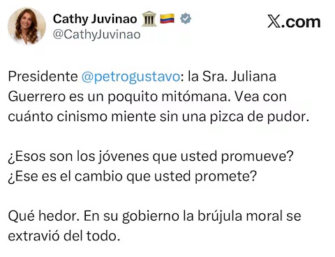 “Presidente @petrogustavo: la Sra. Juliana Guerrero es un poquito mitómana. Vea con cuánto cinismo miente sin una pizca de pudor”, posteó Juvinao en su cuenta personal de X.