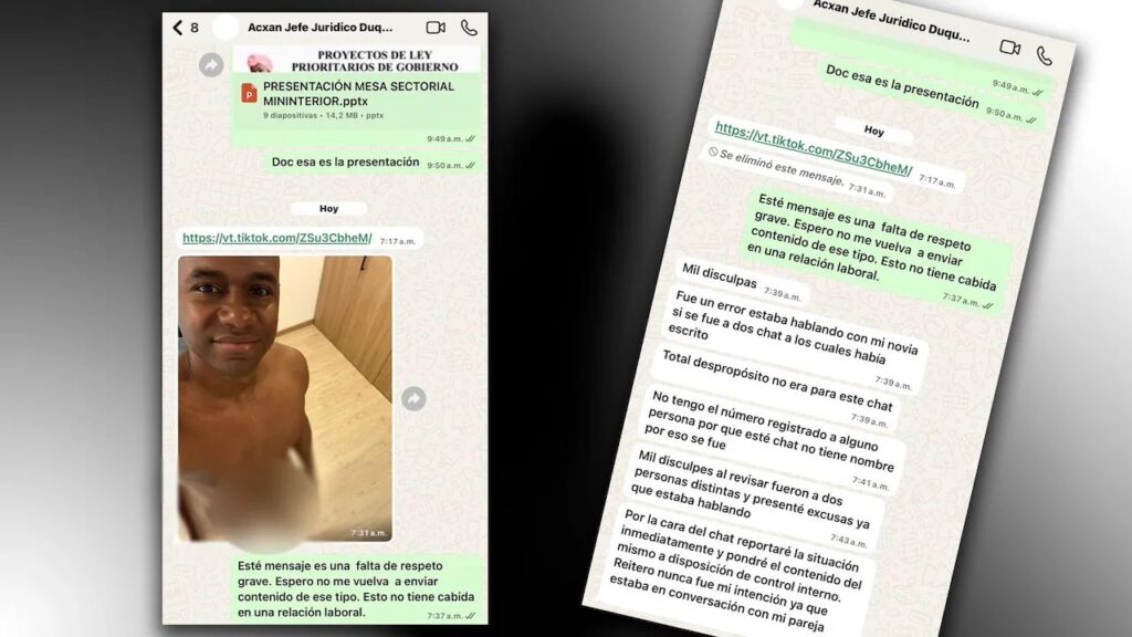 Sobre las 7:31 a. m. llegó la imagen de Duque sin ropa. La receptora lo refutó de inmediato: “Este mensaje es una falta de respeto grave. Espero que no me vuelva a enviar contenido de ese tipo. Esto no tiene cabida en una relación laboral”. Luego, sobre las 7:39 a. m., llegaron las excusas del viceministro por el mismo medio.